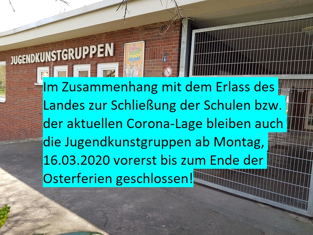 auch die Jugendkunstgruppen werden im Zusammenhang mit dem Erlass des Landes zur Schließung der Schulen bzw. der aktuellen Corona-Lage ab Montag, 16.03.2020, den Kursbetrieb vorerst bis zum Ende der Osterferien einstellen. Hiervon sind alle Kurse, Workshops und Angebote im OGS-Bereich sowie alle Projekte betroffen.