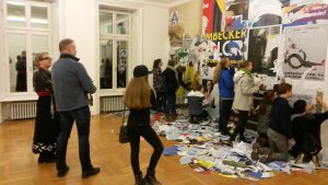 Jetzt aber zu den Filzern und das Bemalen der Wände. Das war natürlich keine Guerilla-Aktion der Jugendkunstgruppen gegen das Museum, die die Kuratorin schockieren konnte. Im Gegenteil, die Aktion gehört zur Ausstellung und erinnert an eine Arbeit des aus Leverkusen stammenden Künstler Wolf Vostell. Er forderte die Betrachter auf, die Plakate an einer von ihm gestalteten Wand ab- und einzureißen und mit eigenen Zeichnungen zu versehen, um so selbst Teil des Kunstwerks zu werden. Diese Idee hat das Museum aufgegriffen und eine solche Wand den Besucherinnen und Besuchern der Ausstellung im Museum Morsbroich zur Verfügung gestellt. Der Möglichkeit, im Museum gleich etwas auf die Wand zu malen, können natürlich die Jugendlichen aus einem Mal- und Zeichenkurs nicht widerstehen.