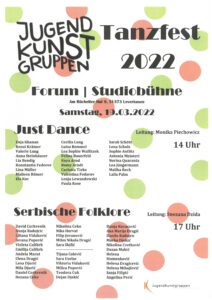 Vorhang auf für die Tänzerinnen und Tänzer der Just Dance Tanzkurse und der serbischen Folklore! – so wird es am 19.03.2022 auf der Studiobühne im Forum heißen. Denn wir veranstalten an diesem Tag ein Tanzfest mit den Kindern und Jugendlichen aus unseren Kursen Just Dance I, II, III, geleitet von Monika Piechowicz und der Serbischen Folklore. geleitet von Snezana Dzida.