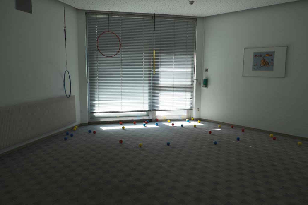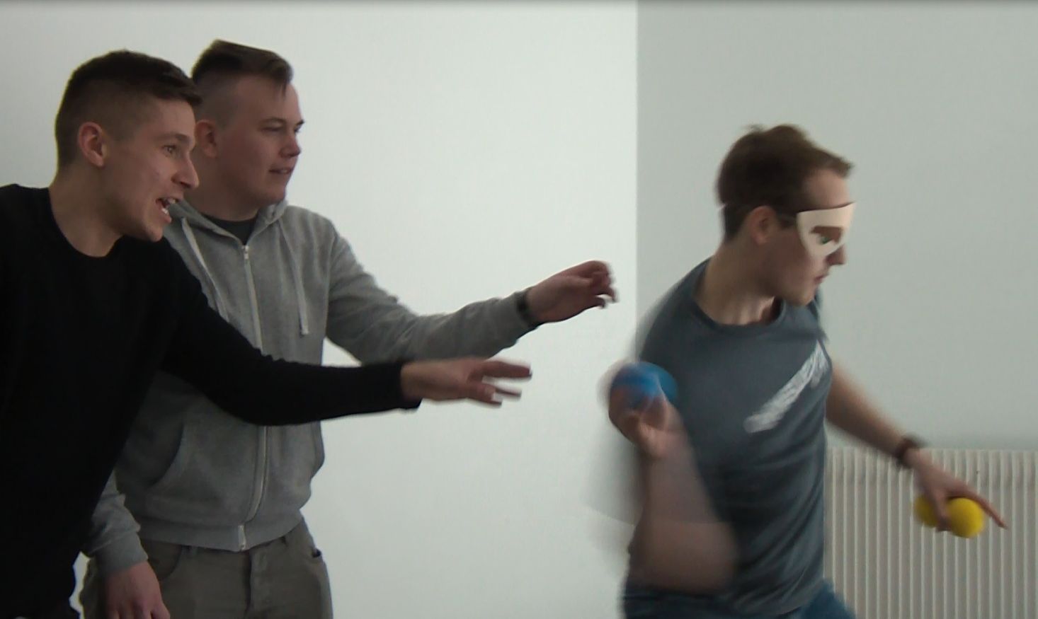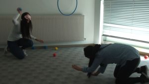 Neben den Informationen gab es auch Raum zum Spielen. Unser analoger Ego-Shooter, der den virtuellen Trend zurück in unsere Welt brachte, ließ Eltern und Kinder gemeinsam spielen. Beim Ego-Shooter spielen immer zwei Personen zusammen. Der eine Mitspieler steht mit verbundenen Augen im Spielfeld, das mit lauter kleinen Schaumstoffbällen gefüllt ist. Der andere Mitspieler steht mit offenen Augen am Spielfeldrand und muss seinen Mitspieler steuern. Ziel ist es, mithilfe der Steuerung die Bälle durch die im Raum montierten Ringe zu werfen oder bei mehreren Mitspielern, den Gegenspieler zu treffen.