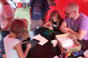 Nach und nach trudeln die Ersten ein und auch zwei Musiker, die über das Gelände ziehen, machen vor unserem Stand halt und singen mit instrumentaler Begleitung einer Gitarre und eines Basses. Und schon kommen die ersten Interessierten. Die Kinder sind sichtlich angetan von unserer aufgebauten Button-Maschine und so muss auch ich ran u