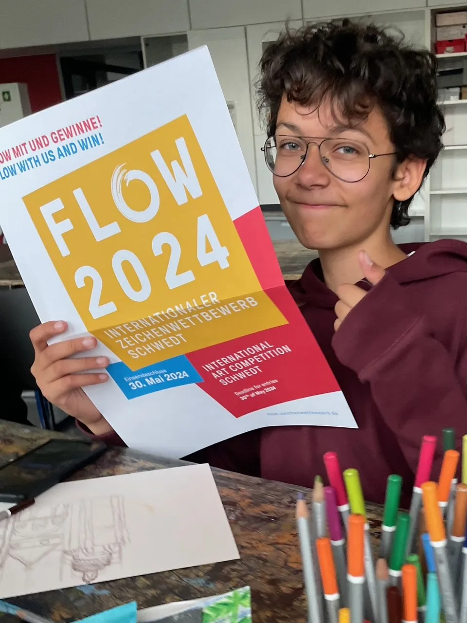 Erfolgreich haben Schülerinnen und Schüler der Jugendkunstgruppen am „FLOW – Internationalen Zeichenwettbewerb Schwedt“ in 2024 teilgenommen. In der Altersgruppe III (12 – 15 Jahre) wurden Michael Schnarr (15) und Simeon Monteiro dos Santos (14) ausgezeichnet, Hannah Ruch (7) erhielt den Sonderpreis des Städtepartnerschaftsvereins 2024. Wir gratulieren den Preisträgern und der Preisträgerin.