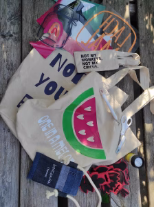 Du kannst deine Textilien zum Beplotten/Bedrucken mitbringen aber auch vor Ort welche kaufen.