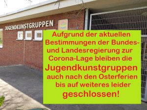 leider bleiben die Jugendkunstgruppen bis auf weiteres geschlossen. Wann wir mit dem Betrieb wieder starten können, ist nicht absehbar, wird aber ständig hinterfragt und überprüft. Auch kann derzeit nicht gesagt werden, ob die Jugendkunstwoche in den Sommerferien stattfinden kann. Sobald es Neuigkeiten dazu gibt, werden wir das mitteilen.
