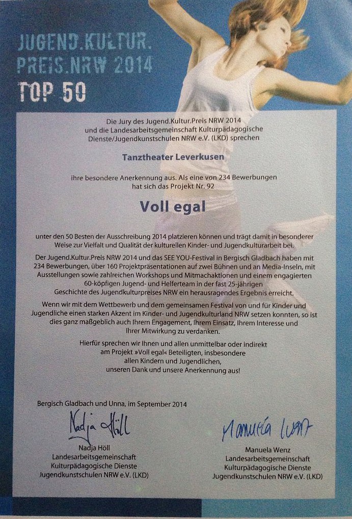 Die Teilnehmer des letztjährigen Tanztheater-Kurses mit Monika Piechowicz haben mit ihrer Produktion „Voll egal“ am Wettbewerb „Jugend.Kultur.Preis NRW 2014“ teilgenommen. Aus 234 Bewerbern wählte die Jury, im Rahmen des „SEE YOU“ Festivals, die besten aus. Unser Tanztheater hat es bis unter die Top 50 geschafft. Wir sind sehr stolz und freuen uns für Piechowiczs Truppe. Auch dieses Jahr leitet Monika Piechowicz wieder eine Tanztheater-Kurs bei den Jugendkunstgruppen in Küppersteg. Die nächste Probe findet am 26.10.2014 statt und eine Anmeldung ist jederzeit möglich. Mehr Infos dazu gibt es hier. Mehr Infos zum SEE YOU Festival und zum Jugend.Kultur.Preis NRW 2014 gibt es hier