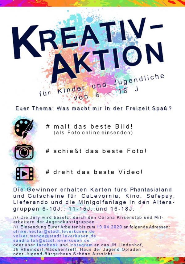 oder über facebook und instagram an das JH Lindenhof, Jh Rheindorf, Mädchentreff, Haus der Jugend Opladen oder Jugend-Bürgerhaus Schöne Aussicht