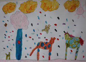 Im Malsaal der Jugendkunstgruppen tauchen viele Kinder mit Farbe, Stiften, Pinsel und Papier in eine ganz eigene Welt ab. Mit kräftigen Farben oder dünnen Strichen zeigen sie uns ihre Sicht der Dinge. Die Kinder malen ein Bild nach dem anderen, variieren ein Thema und versuchen immer wieder etwas Neues. So entstehen mehr Bilder als sie mit nach Hause nehmen wollen, mache bleiben unvollendet oder sie werden vergessen. Daher sind große Papierstapel auf jeder Ablagefläche im Malsaal ganz normal. Ein bisschen Chaos gehört auch zur Atelieratmosphäre.