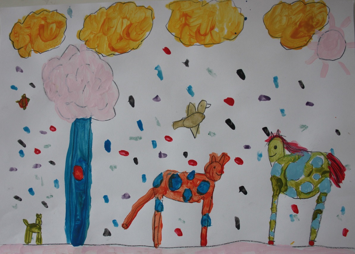 Außerdem finden sich in den Papierstapeln viele Schätze, die gehoben und gezeigt werden sollten, wie jetzt in der Ausstellung „Liegen geblieben“. Die Bilder glänzen nicht durch Perfektion, sondern mit der unverfälschten, fröhlichen Sicht aus Kinderaugen auf die Welt. Das Schöne ist, dass es eine sehr fröhliche Sicht auf die Welt ist. Im Malsaal der Kinder lächeln auch die Tiere. Das mit der Perfektion kommt dann mit der Zeit, wenn sie gebraucht wird.