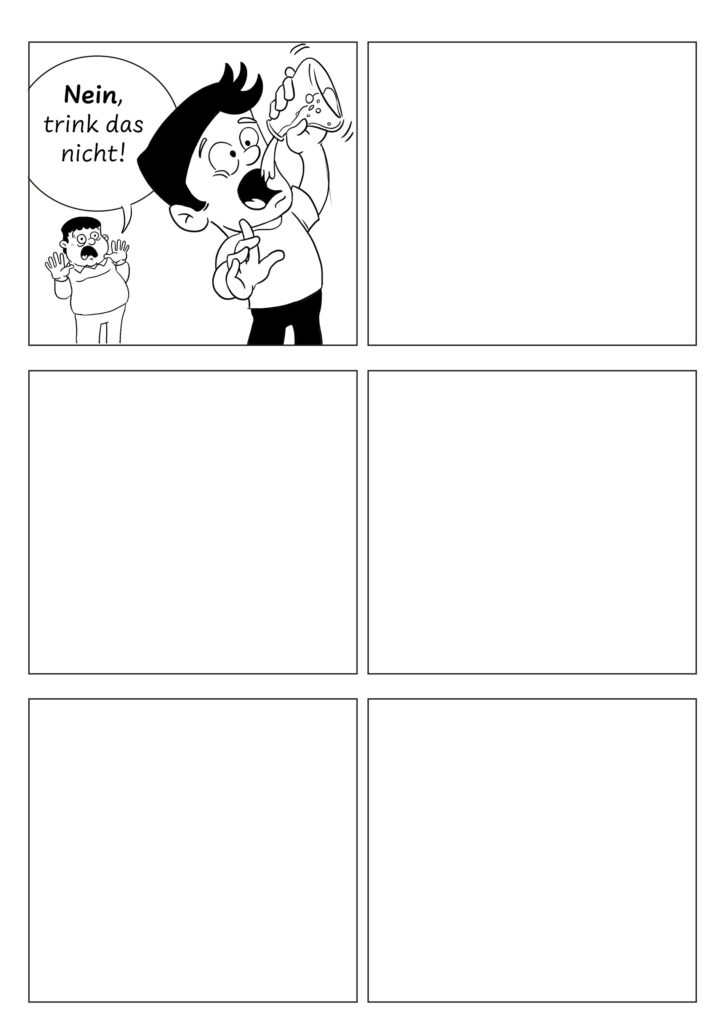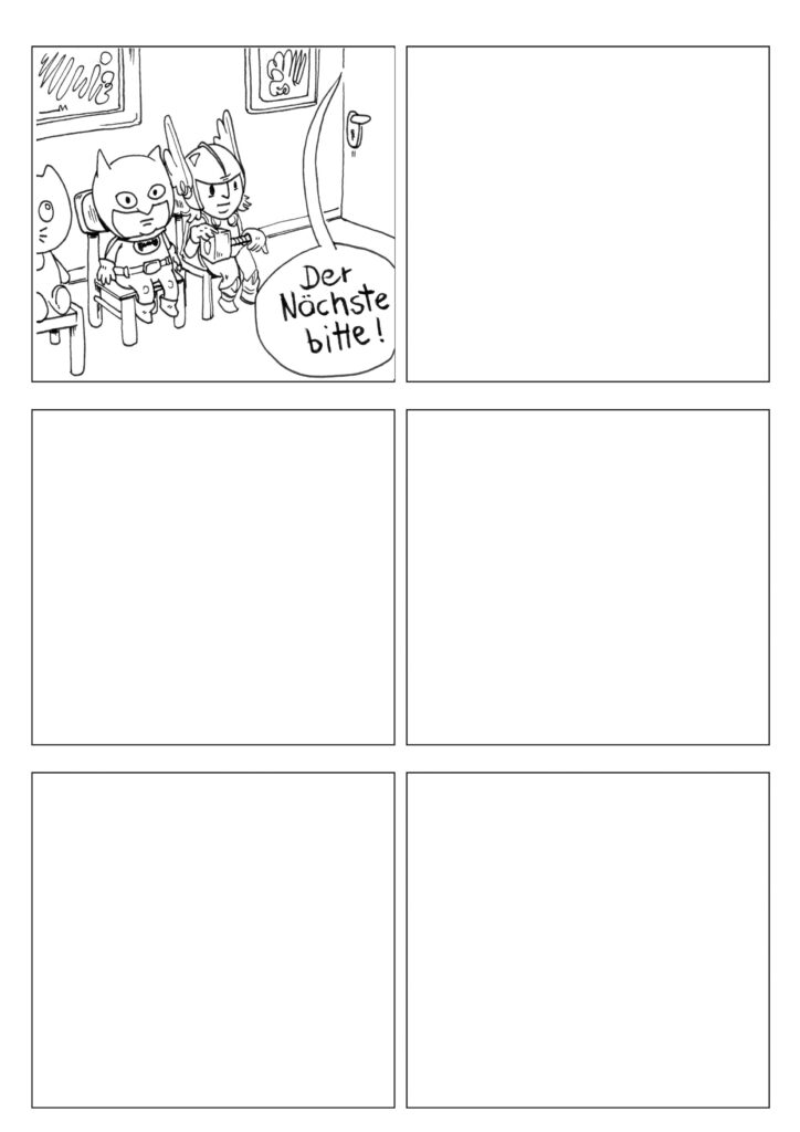 Das erste Panel ist schon gefüllt aber wie geht es weiter? Vielleicht fällt dir ja was ein! Wie die Geschichte weiter geht, entscheidest du. Viel Spaß!“