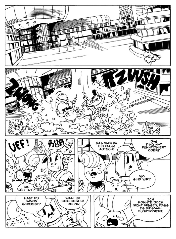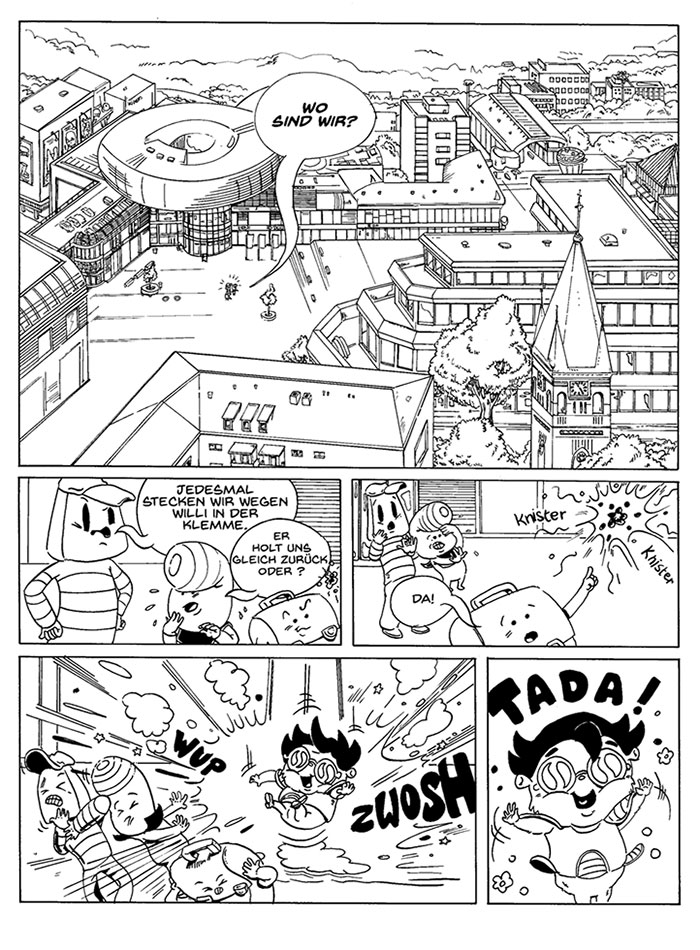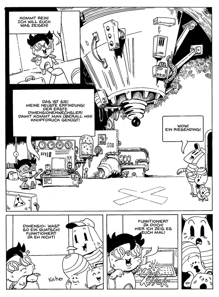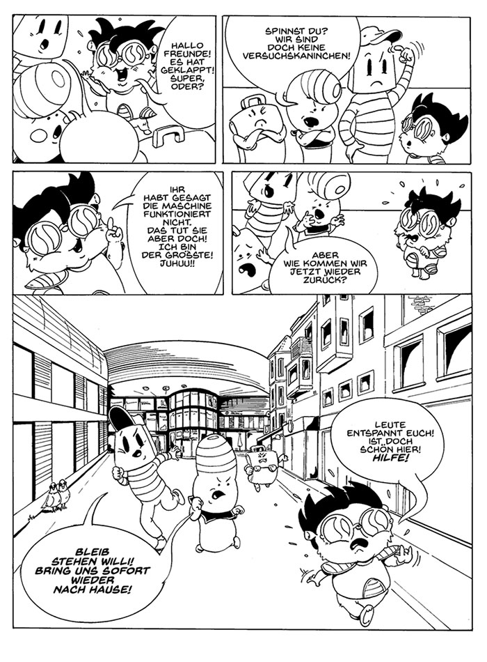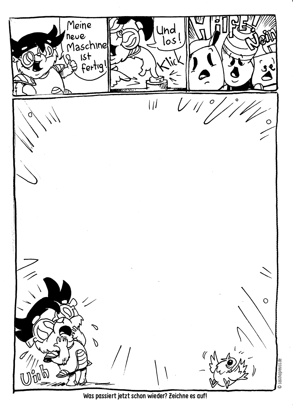 Es hat etwas gedauert aber Willi hat eine neue Maschine gebaut. Wird das die Rückkehr nach Hause ermöglichen oder passiert etwas ganz anderes mit den armen Versuchskaninchen? Zeichne es auf!