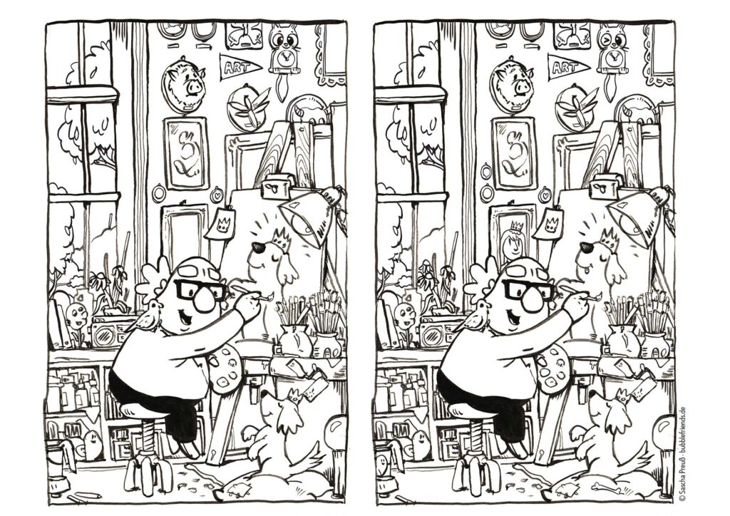 Wie du siehst, bleibt Professor Puschel mit seinem Hund natürlich auch zu Hause. Aber, vergleiche mal die Bilder, da stimmt doch etwas nicht.