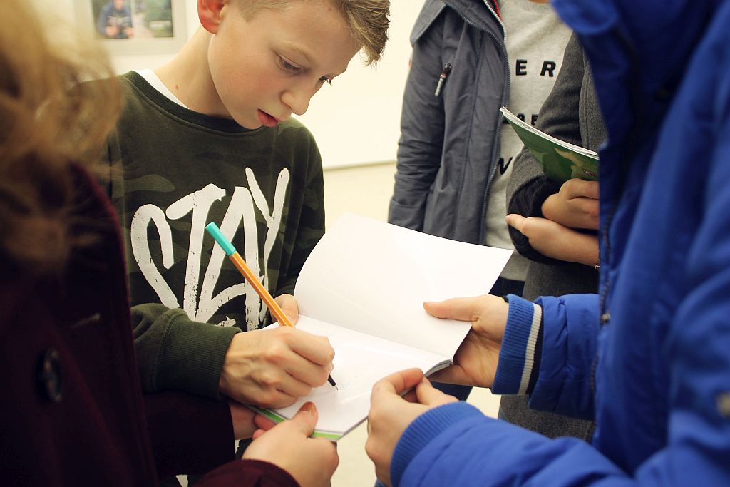 Nun eröffnete die Ausstellung ein zweites Mal, diesmal in der Galerie im Forum. Durch die Veranstaltungen im Forum bekommt die Ausstellung viele hunderte von Besuchern, was die Jugendlichen besonders freut. Zusätzlich gab es auch einen besonderes Anlass, denn das Projekt ist nun auch als Buch erschienen und das wurde zur Ausstellung präsentiert. Freunde, Familie und besonders die KünstlerInnen selbst betrachteten somit stolz ihre eigenen Werke in einem richtigen Buch. Nina und Henk, zwei der neun KünstlerInnen lasen aus dem Buch ihre Geschichte vor und erzählten, wie der Prozess der Ideenfindung für sie persönlich bedeutete. Der Abend bekam Charakter einer kleinen Lesung, denn später signierten die Künstlerinnen auch ihre Bücher und durften sich zudem über ihre Lieblingsplätze, Techniken und Zeitaufwand mit der Presse unterhalten.